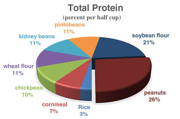 Peanuts contain 26% protein per half-cup, the highest among commonly available plant-based protein sources such as soybean flour (21%), kidney beans (11%), and chickpeas (10%).